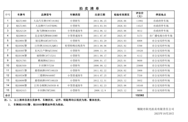 受委托,我公司定于2025年11月3日(星期一)上午9时30分在铜陵市公共资源交易中心网站电子竞价系统平台对以下标的进行公开拍卖,现公告如下: