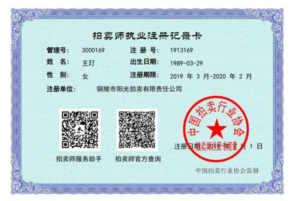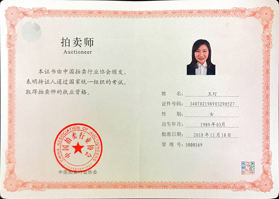 王玎,女,中共党员,国家注册拍卖师(执业号:3000169),从事拍卖业以来,致力于维护委托人和买受人权益。工作涉及拍卖项目策划、招商、拍卖会主持、标的确权等环节。她的主持风格随和亲切,机智敏捷,能及时有效地抓住竞买人心理,恰到好处的调动现场的竞价气氛。主持的拍卖会涉及国有资产拍卖、资产,土地拍卖等。