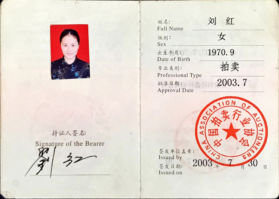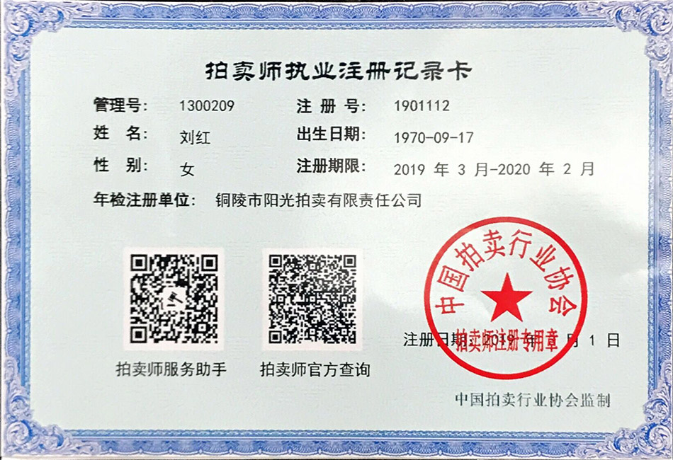 刘红,女,研究生, 致公党党员, 政协委员,市人大代表,国家注册拍卖师(执业证号:1300209),国土资源部招拍挂主持人,现任安徽省铜陵市阳光拍卖有限责任公司董事长。其从事拍卖工作多年,主持风格庄重、稳健、儒雅大方、富有感染力,善于驾驭大型拍卖活动,能很好的把握拍卖节奏,调动广大竞买人的购买积极性。已成功策划、主持过二百余场拍卖会,有着丰富的拍卖知识和实践经验。曾荣获 “全国职工演讲比赛”一等奖、“全国优秀拍卖师”、“安徽省优秀拍卖师”等光荣称号,并于2006年,在第二届“中拍杯”全国拍卖师主持技巧竞赛中获得优胜奖。