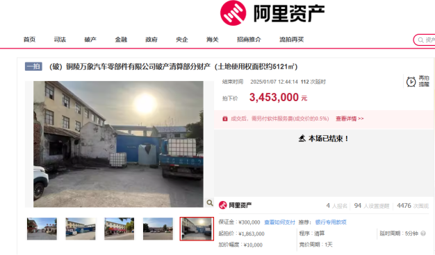 受委托,我公司于2025年1月6日上午10时至7日上午10时,通过淘宝网以电子竞价方式对“铜陵万象汽车零部件有限公司破产清算部分财产(土地使用权面积约5121㎡)”进行公开拍卖,底价186.3万元,经过100多轮激烈的竞争,最终以345.3万元成交!溢价率达85%!!!